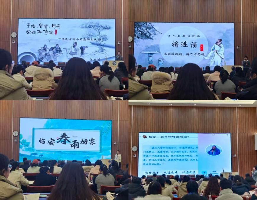 本次比赛由丁明利老师主持。比赛中,汪思睿、李秀华、王雨霏三位教师分别以《子路、曾皙、冉有、公西华侍坐》、《将进酒》、《临安春雨初霁》为题,呈现三堂融合AI技术的创新课堂。王思睿借AI对话还原孔门论志场景,以“为何独赞曾皙”为核心问题驱动深度研讨;李秀华以“心灵疗愈师”角色任务引导学生解析李白诗情起伏;王雨霏紧扣“闲”字意象,通过对比诵读与背景勾连,层层揭示陆游沉郁心境。