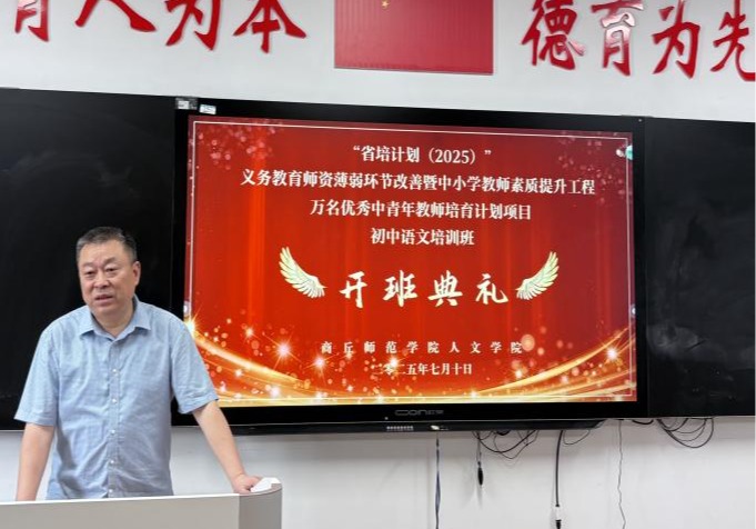 2025年7月11日上午,由商丘师范学院人文学院承办的“省培计划(2025)”——义务教育师资薄弱环节改善暨中小学教师素质提升工程万名优秀中青年教师培育计划初中语文班,在睢阳校区8号楼306教室正式开班。开班典礼由邹琨老师主持,来自河南省郑州、洛阳等十几个地市的50名优秀中青年教师参加,首席专家冯志伟出席了仪式并致辞。