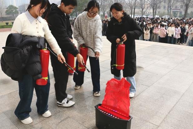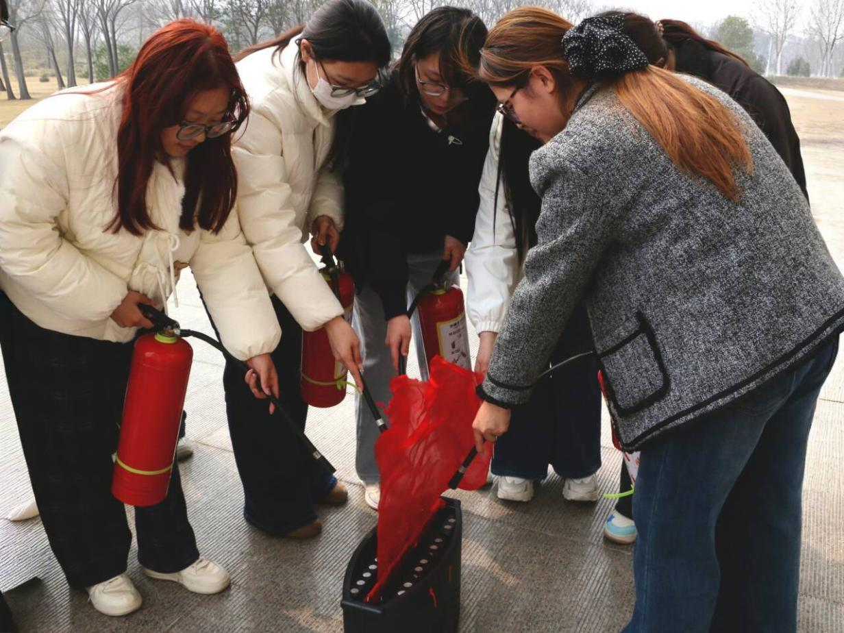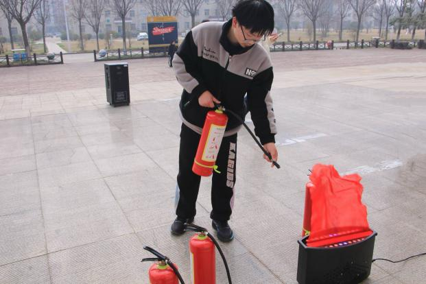 活动伊始,王超老师结合校园电器使用多、用火用电隐患突出等实际情况,明确了日常防火注意事项。活动中,王超介绍了不同类型灭火器的适用场景,并分步示范标准操作流程:先检查灭火器指针是否处于正常区域,再拔掉保险销,一手提握器身、一手紧握喷嘴,对准火焰根部按压扫射直至灭火。讲解结束后,学生分组进行实操练习,认真学习、规范操作,熟练掌握了灭火器的使用技巧。